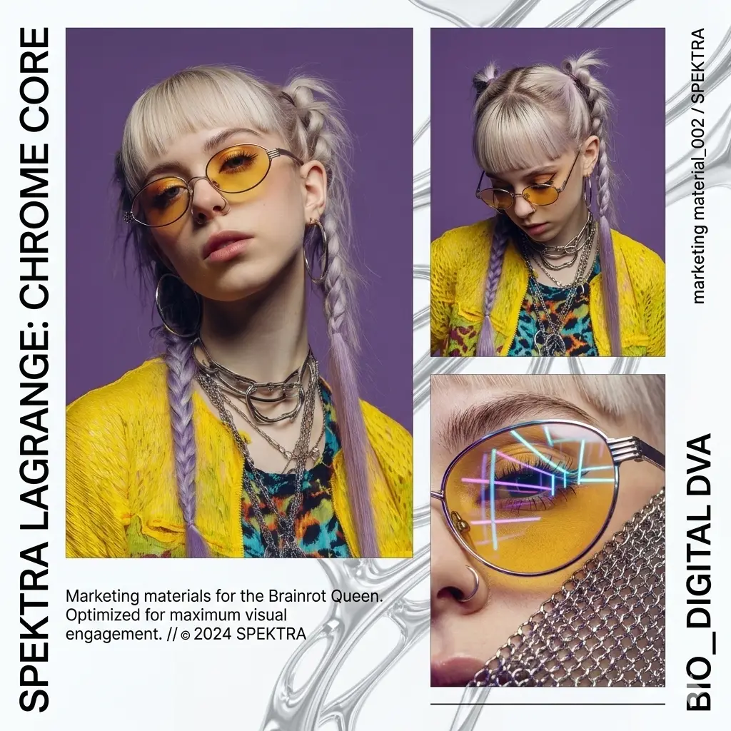 100% Synthetic. 0% Logic. Spektra is what happens when you leave 50 tabs open and your GPU starts melting. Chronic scrolling, chrome-plated crowns, and 180bpm sugar-rushes. She’s the soundtrack to your feed-scrolling addiction and the voice inside the fiber-optic cables. Current Status: Uploading... 📶 Location: The Recycle Bin 🗑️